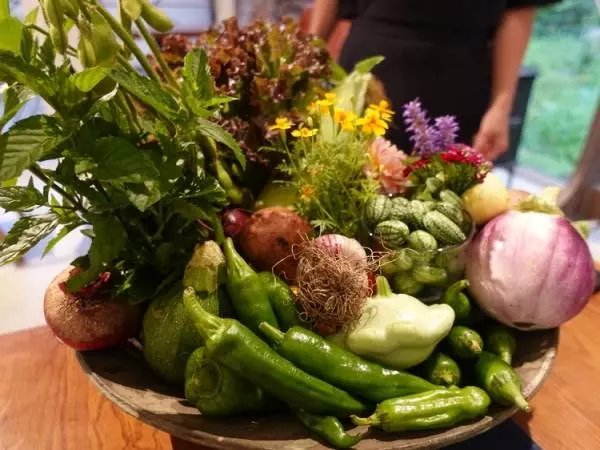夏の終わりは1年のなかで最も種類の多い時期だそう。秋の野菜も含まれ、じゃがいも、枝豆、なす、UFOズッキーニ、ピーマン、万願寺とうがらし、ししとう、マイクロきゅうり、マリーゴールドも食用です。五感が研ぎ澄まされた状態で見る、これらの鮮烈な美しさ。忘れられません。