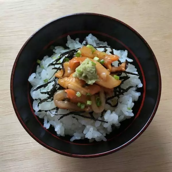 3)温かい御飯に刻み海苔をまぶし、2を乗せてわさびを乗せ、小葱をまぶす。