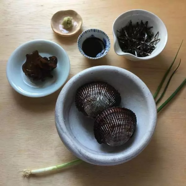 1)赤貝は殻から外し、内臓を取り去る。身とヒモを塩でもみ洗いし、細切りにして、醤油を絡めておく。