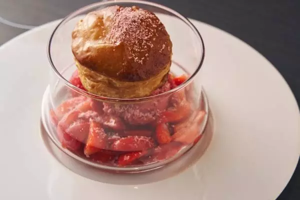 『ふくらませてキャラメリゼしたパイ生地、ホワイトチョコレートのムースを詰めて、いちごのタルタルとそのクーリーソース、いちごのソルベットと共に』