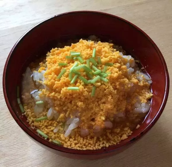 ゆで卵の黄身を裏ごしし、山吹の花に見立てた色鮮やかなご飯です。