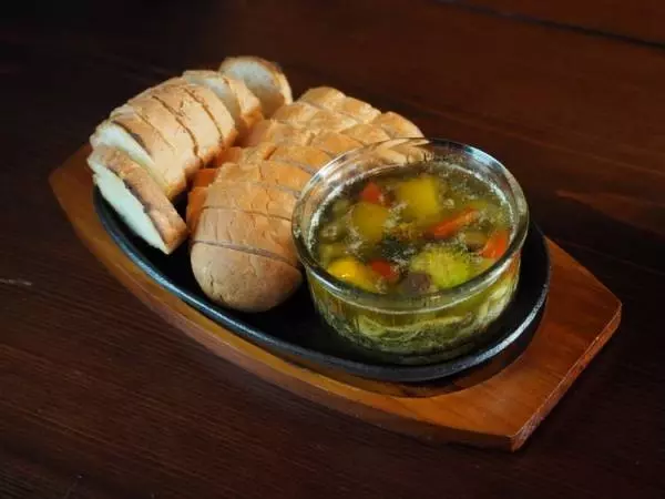 材料はにんにく、海老、ブロッコリー、しめじ、パプリカ……と、一見普通のアヒージョのようですが、底には焼いて身をほぐしたくさやが敷きつめられています。熱々のオイルとにんにくのせいか、くさやの香りはおさえられており、あまり気になりません。味は「少し塩味が強めのアンチョビ」といったイメージで、お酒との相性は抜群です。
