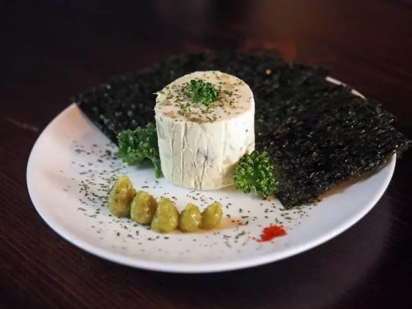くさやとクリームチーズ、細かく刻まれた燻りがっこを冷やして固めた『くさやと燻りがっこのクリームチーズディップ海苔』。