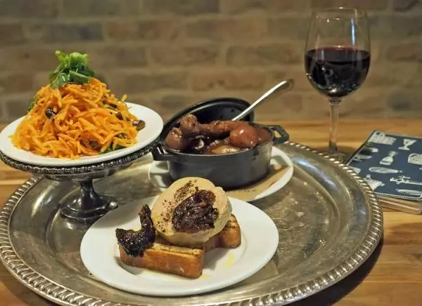 左から時計回りに『キャロットラペ』1,200円、『コック オ ヴァン(鶏の赤ワイン煮)』1,800円、『チキンレバームース』1,000円(すべて税抜)