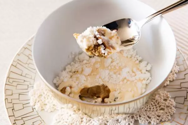 ポレンタの粉で焼いたビスコッティ、キャラメルジェラート、松の実、レーズンの上に、目の前で練り上げた滑らかなクリームをたっぷりのせ、白いエスプレッソパウダーをトッピングする“白いティラミス”