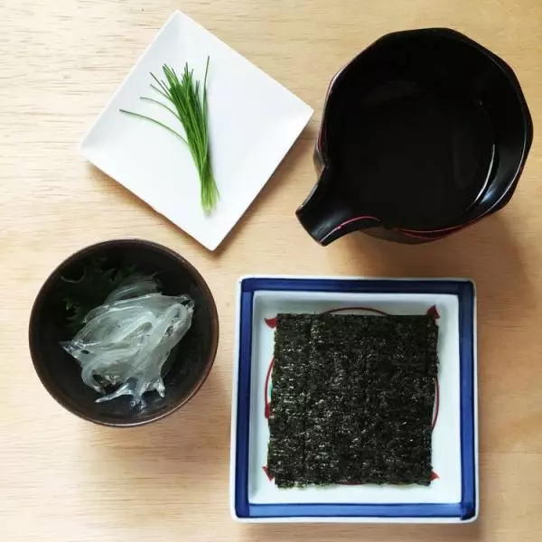 3)出汁に塩と醤油を入れて温め、器に盛った御飯にかける。その上に炙った海苔と2を乗せ、芽葱、山葵などを添える。