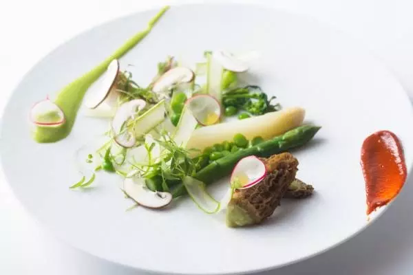 この日即興でガニェール氏がつくった一皿。インタビューしたのは4月末。春の生き生きとした食材がにぎやかに皿を彩る
