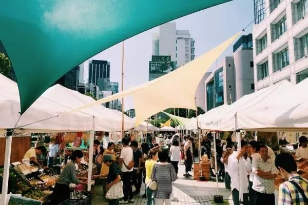 青山の街にぽっかりと空いたのどかな空の下、心地よい風が吹くマーケット。売り手も買い手も楽しそう。