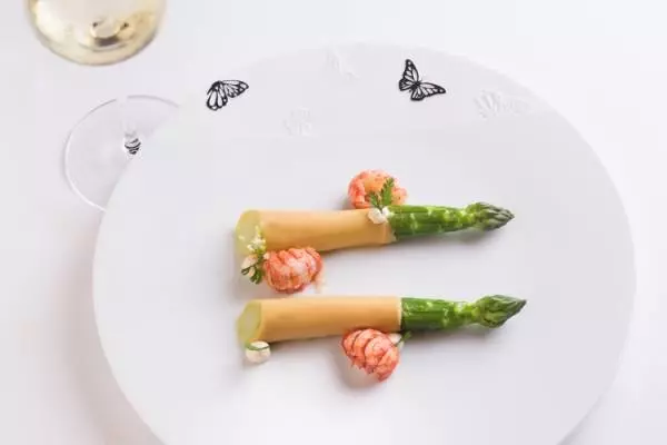 旬のアスパラガスは、その日の朝に仕込んだもののみを使用し香りを引き立たせ、脇を固めるザリガニは調理寸前まで活きていたものに軽く火入れをします。一見、味の手数は少なく見えるが、芯の部分に魚のエキスを潜ませたり、アスパラの根元はビスクソースで包んでみたりと、ひと皿で幾重にも重層的に味わいが押し寄せてくるのです