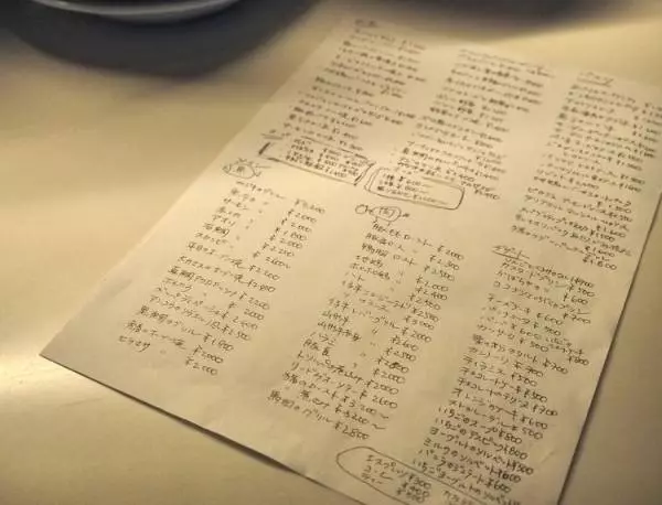 メニューは白い紙に手書きしたもののコピーです。A4サイズの紙にびっしりと並んだ膨大なメニューを見て、あれこれ目移りするのもこのお店の楽しみ方。欲張りな私は、いつも迷います。開業以来何度も訪れているのに、まだ食べたことのないメニューがある。