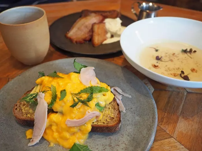 『アボカドとスクランブルエッグのオープンサンドと自家製ハム』、『フレンチトースト 自家製ベーコンとブッラータチーズ』、『季節のスープ』、『ハーブティー』