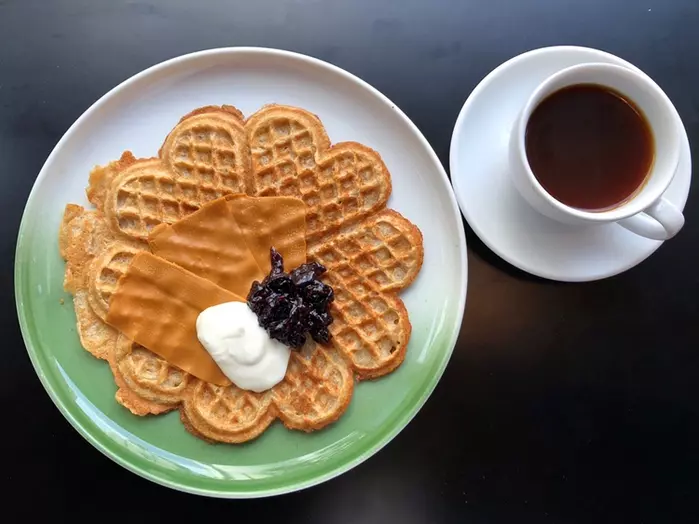 【FUGLEN】特有の明るい酸味の浅煎りコーヒーとパンが楽しめるほか、人気のフードメニューは3種から選べる『ノルウェーワッフル』。写真は「ブラウンチーズとサワークリーム、自家製ジャムのトッピング」で、甘いベリージャムとチーズの塩気の組み合わせに、サワークリームのほどよい酸味がクセになる、甘すぎず朝にぴったりの味わいです。