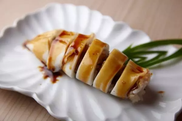 薬味を混ぜたシャリを煮イカの中に詰める『印籠詰め』は、古い文献にもみられる伝統的なお料理。かんぴょう、ガリ、もみのりを混ぜたシャリを、柔らかく煮たイカの中に詰めています。濃厚なツメの味わいや薬味の風味、ほのかに香る柚子などが絶妙なバランスでおいしさを演出します。