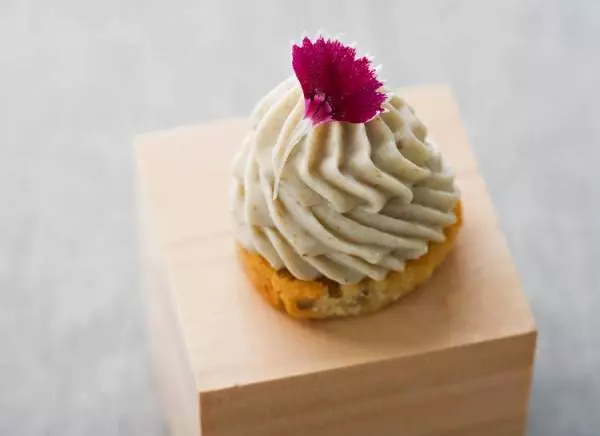 パルメザンチーズと米粉を合わせたクッキーの上に、木綿豆腐のピューレで滑らかさを加えた牛蒡のタルト『牛蒡』(アミューズの一品)
