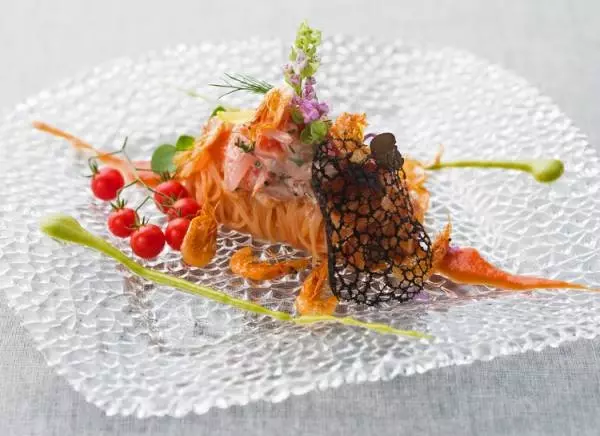 夏の間(6~9月)に供される、野崎シェフのスペシャリテ『桜海老の冷製カペリーニ トマト 山葵』。
