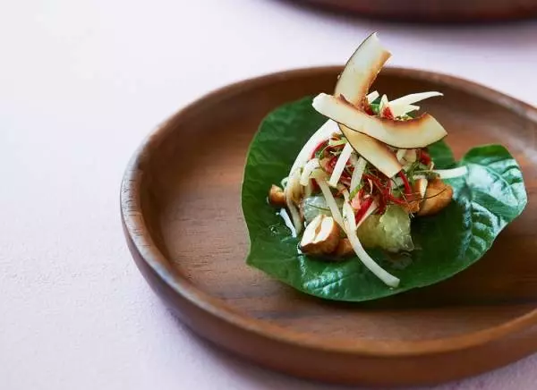 チャプルーという芳香の強い葉に、海老やピーナッツソースを包んで食べる『ミャンカム』1P 400円(税・サ別)※具材は季節によって変わります
