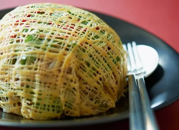 ポークやエビ、ビーンスプラウトの上に、蜘蛛の巣に見立てた卵をかぶせた、フォトジェニックなサラダ『“エッグネット”ビーンスプラウトサラダ』フル2,300円、ハーフ1,380円(税・サ別)