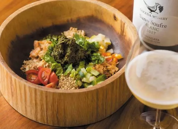 干しエビやナッツ類、食感や香りのアクセントになる素材が計12種類、発酵させた無農薬の福岡の八女茶に和えていただく『ティーリーフのサラダ』1,800円(税込)