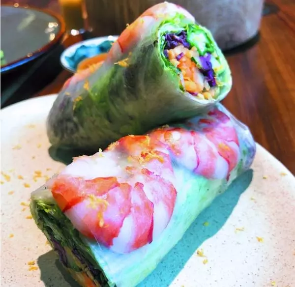 秋田のしょっつるベースのソースでいただく『10種のハーブ&季節野菜 エビの生春巻き』1本1,000円(税込)。柴漬けやパイナップルなど意外な組み合わせが面白い