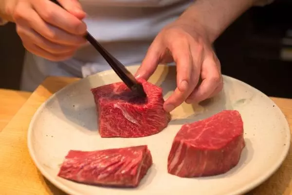 肉が乾かぬよう牛脂を塗る。手前から時計回りにサガリ、サーロイン、ヒレなど