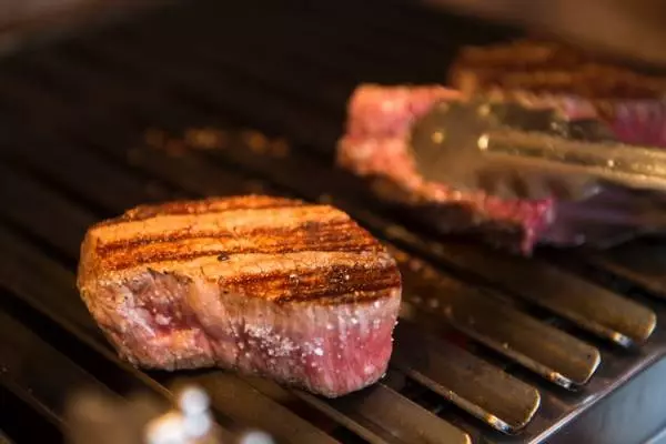 最初に両面を焼き固めた後、両面のみに火を入れる。「側面は、肉が縮むので焼きません」 とは大久保料理長