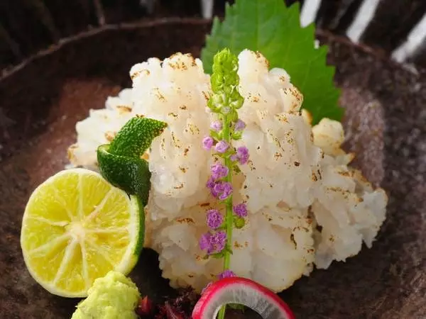 東門筋から一本、東の道に入った角にある日本料理店。純和風の落ち着いた佇まいで、店内に足を踏み入れると、「なぐり加工」の木材が使用された、しっとりと手ざわりが心地よい店自慢のカウンターが出迎える。ゆったりと大人っぽいムードでの食事ができるよう、隣の席との間にも余裕をもうけているのもうれしい心配り。そんな雰囲気にふさわしく、料理からもていねいさ、端正さが垣間見える。