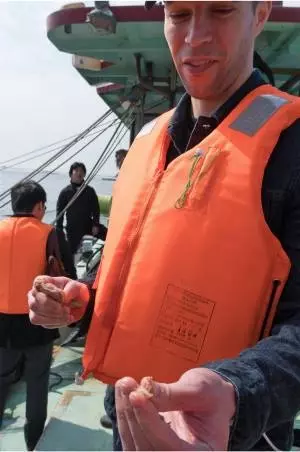 鰯を使った養殖場の餌を「食べてみよう」と勧めるマックスにつられて皆で試食。