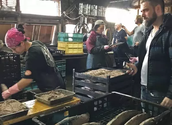 茹でた鰹にすり身を塗る作業に見とれるルカ
