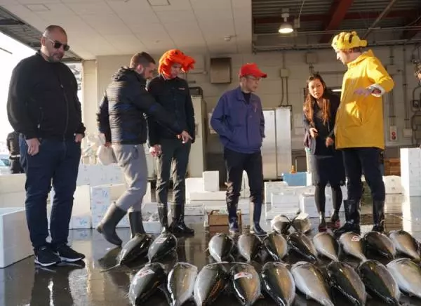 凄腕シェフたちが童心に返って、好奇心に身をゆだねて満喫したのが、かごしま魚市場でした。入場前の記念写真でふざけて身につけた魚のかぶりものを外すことも忘れて、颯爽と市場内を歩き回り、突っ込んだ質問を繰り出し、見るものすべてを吸収しようと貪欲に楽しむシェフたちの姿に場内騒然。「あの人たち、有名なシェフなんだって、鋭い質問どんどん来るよ」という声があちこちで聞こえて来て、ちょっとした旋風を巻き起こしていました。