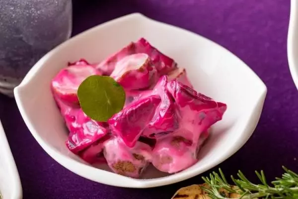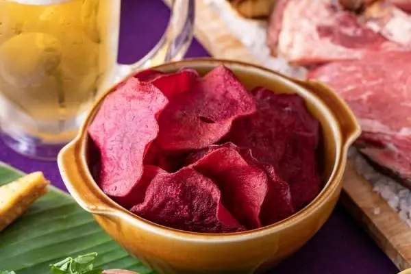 コースの一品『ビーツチップ』など、珍しいバイオレットメニューが楽しめる