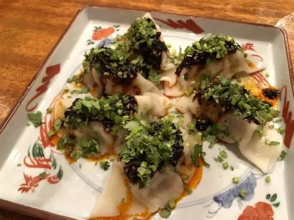 こちらはパクチーがたっぷりかかった水餃子『四川風麻辣水餃子』560円(税込)。そのままでも、黒酢をつけても、辣油をプラスしてもウマい