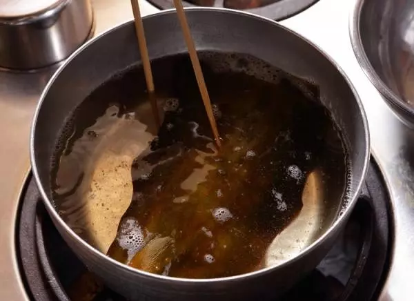 ❸ 30 ~ 40分ほど煮出したら、昆布を取り出す。