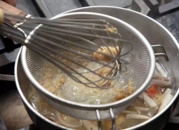 完成直前に麦味噌をときやさしい味わいに仕上げる