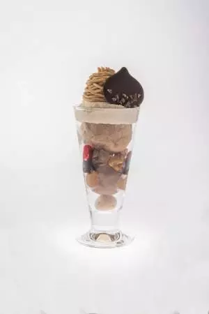 毎年秋恒例のマロンパフェの今年のテーマはモンブラン。キャラメリゼしたクルミの香ばしさと、ラム酒“トロワリビエール”が口に広がるマロンのアイスとクリームの組み合わせは至福の味わい。酸味の効いたカシスのソースがアクセントを加えます。