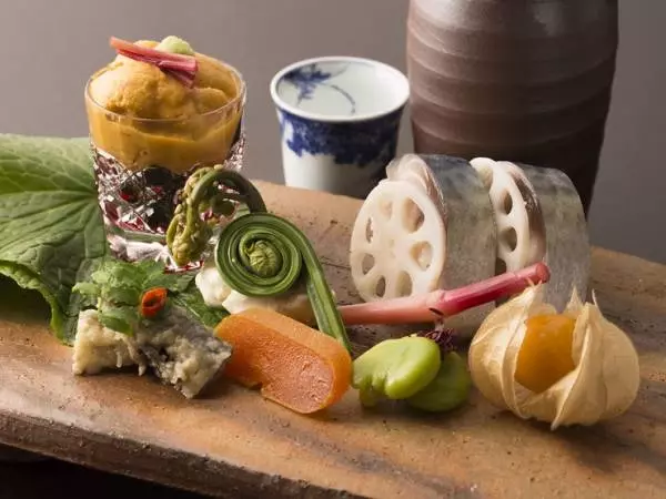 厳選された食材を使った、熟練の料理人による一品一品は、日本の四季を感じさせてくれる料理ばかり。この時季にしかない生の新さんまと天然柚子を使用した『締め秋刀魚の棒寿司』は、北海道の脂がのった新さんまを塩と酢でさっと〆て一晩寝かして、しっかりなじませて棒寿司に仕上げたもの。季節によって内容が変わる懐石コースをご堪能ください。