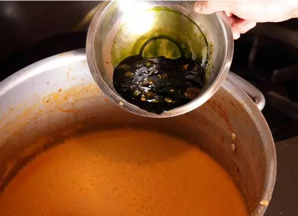 海老のミソはあらかじめ頭から取り出し、別の容器に移しておく。殻のまま使ってしまうと、溶け出しきらないことがあり、使える量が少なくなってしまう。スープに戻すタイミングは、骨やヒレ、オマール海老の殻などをこしたあと。ハンドミキサーを使って、スープにしっかりと溶けるようにかき混ぜ、さらにもう少し細かくこす。こうすることで、濃厚さと旨みが増しつつ、なめらかな舌触りのスープができあがる。