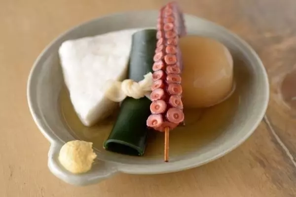 大正4年創業の100年続く老舗のおでん屋で、常時40種類がそろっています。その素材によって味の染み方や煮込み時間は異なり、一つ一つの種の旨味を最大限に引き出すために、それぞれに最適の下ごしらえを施しています。しっかりと出汁は効きながらも醤油が尖っておらずまろやかな口当たりのつゆには、素材から出た旨味がたっぷり。