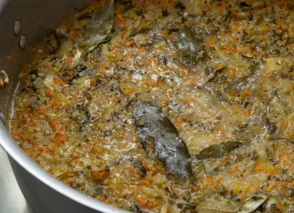 ❸ 鍋にオリーブオイルを熱し、Ⓑのにんにくを炒める。香りがたったら2 の野菜を一気に入れ、中火で炒める。しんなりしたら、ハーブ類を加えて炒める。白ワインを入れてアルコールを飛ばし、さらに15分~20分ほどゆっくり炒める。
