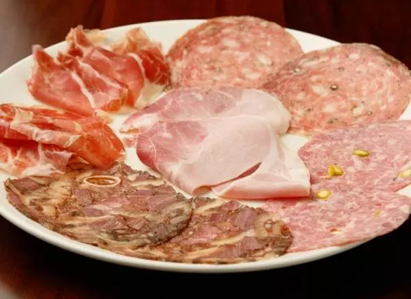 モルタデッラや豚の耳などをゼラチンで寄せたもの、肩ロースとももの2種類の生ハム、ボンレスハムなど『自家製ハムの盛り合わせ』3,000円(2人前)