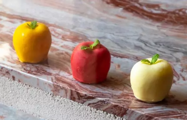 人気の『フリュレ』は、フルーツをかたどったチョコレートの中に、ヨーグルトのクリームと季節の果実が入ったデセール