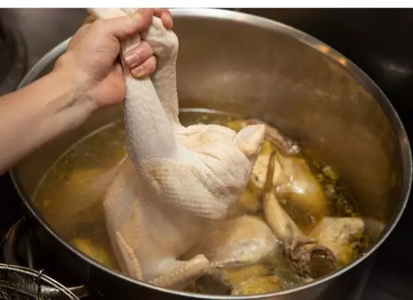 丸鶏を鶏スープでゆで、余熱で火を入れる