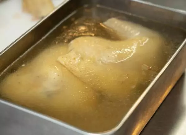 丸鶏を、もも、手羽、胸肉とさばき、鶏スープに香味野菜と塩で調味したつけだれに1時間以上漬け、じっくりと味を含ませる。