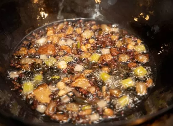 24種の生薬と香味野菜の風味と香りをじっくり油に移し、その油で唐辛子の辛味を出した自家製辣油の香りがかけだれの肝。