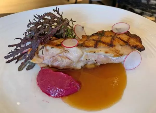 メインの肉料理『信玄鳥もも肉のハーブグリル 燻製したバニラ風味のジュ・ド・ヴォライユ』は、富士山麓の伏流水で育てられたジューシーな鶏を使用。ハーブオイルに漬けしっとりとさせたら、ローズをイメージした赤大根のピンク色のピュレとバニラ香るソースでコレクションを表現しています。