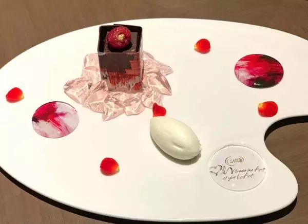 デザートはバレンタインの時期にぴったりなチョコレートケーキ『オペラ ローズゼリーとバニラアイスを添えて ローズスプラッシュ風』。コレクションのパッケージをイメージしたチョコレートのボックスの中に、大人の風味のオペラがイン。