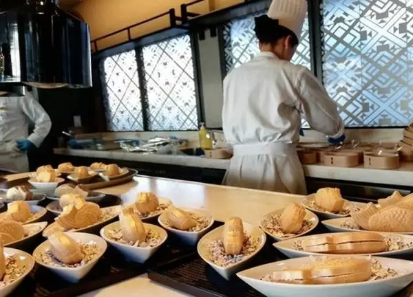 2号車のオープンキッチンでは料理がつくられており、車両にはふんわりといい香りが漂う