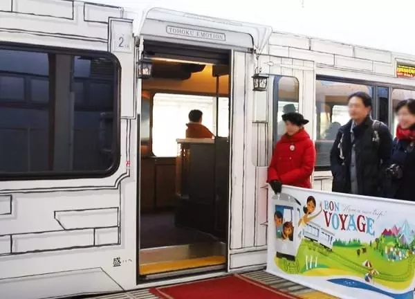 車両へ繋がる赤い絨毯と、「良い旅を!」を意味するBON VOYAGEの垂れ幕が、特別な空間へと誘う