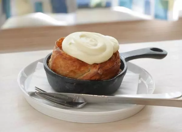 特に人気なのが、イートイン限定の『焼きたてクロワッサンシナモンロール』。クロワッサン生地でつくったシナモンロールを、オーダーを受けてからひとつひとつ丁寧に焼き上げ、クリームチーズのアイシングと一緒にいただきます。