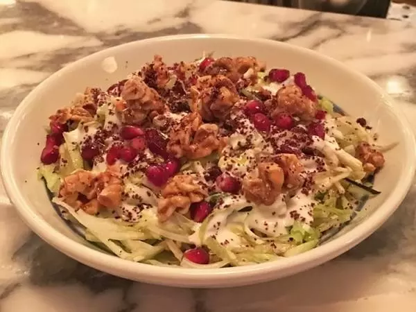 サラダにザクロの実、クルミ、ヨーグルトなどがのったギリシャらしい味が楽しめる