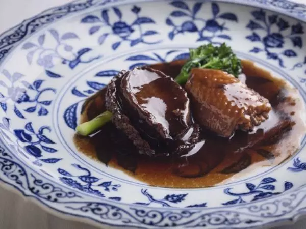 楊貴妃が好んだ品をひと皿にした『蝦夷アワビとおおいた冠地どりの手羽先の赤ワイン煮込み』
